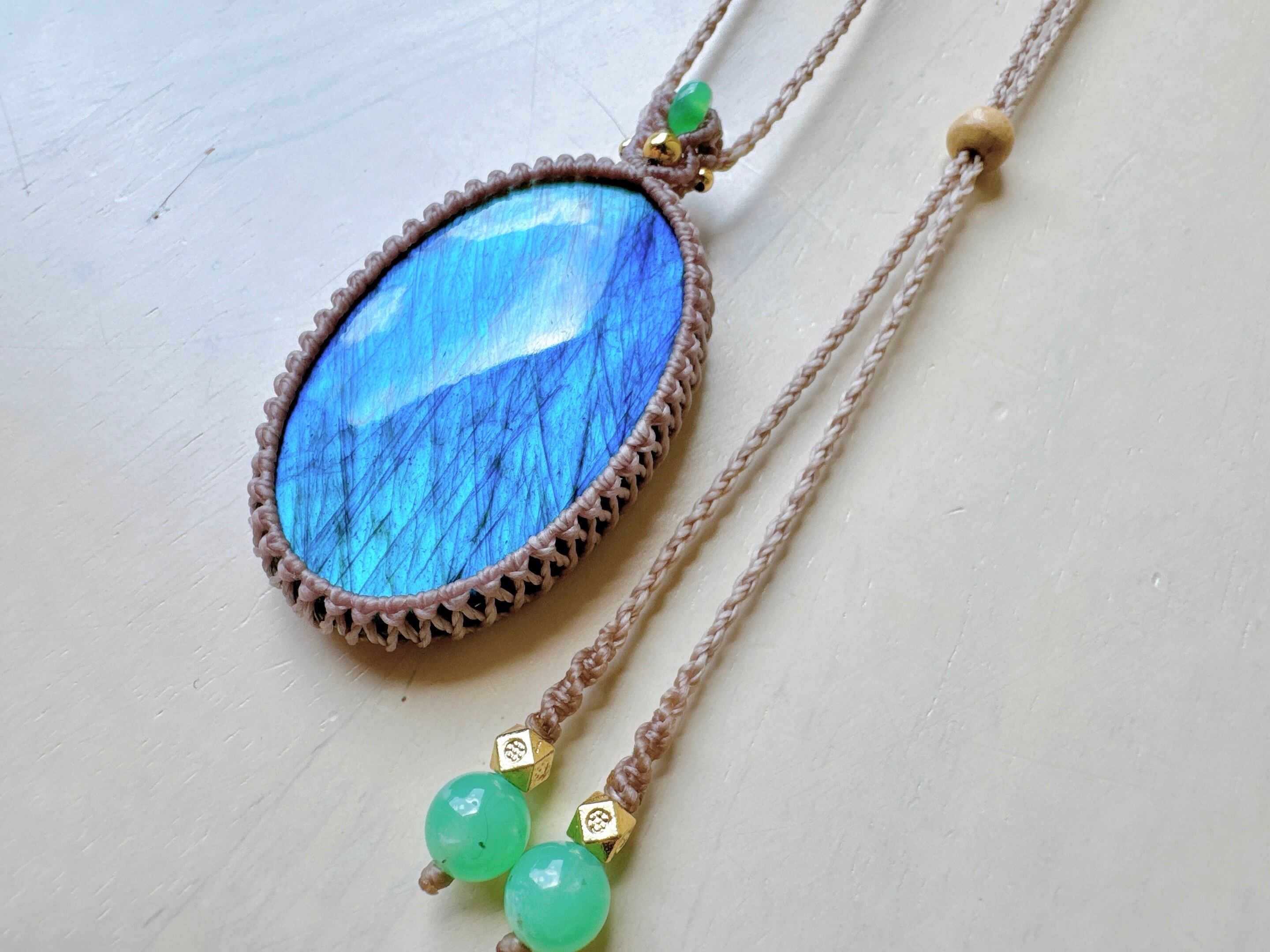 青いシラーが美しい、面が大きなラブラドライトにクリソプレーズを合わせました。