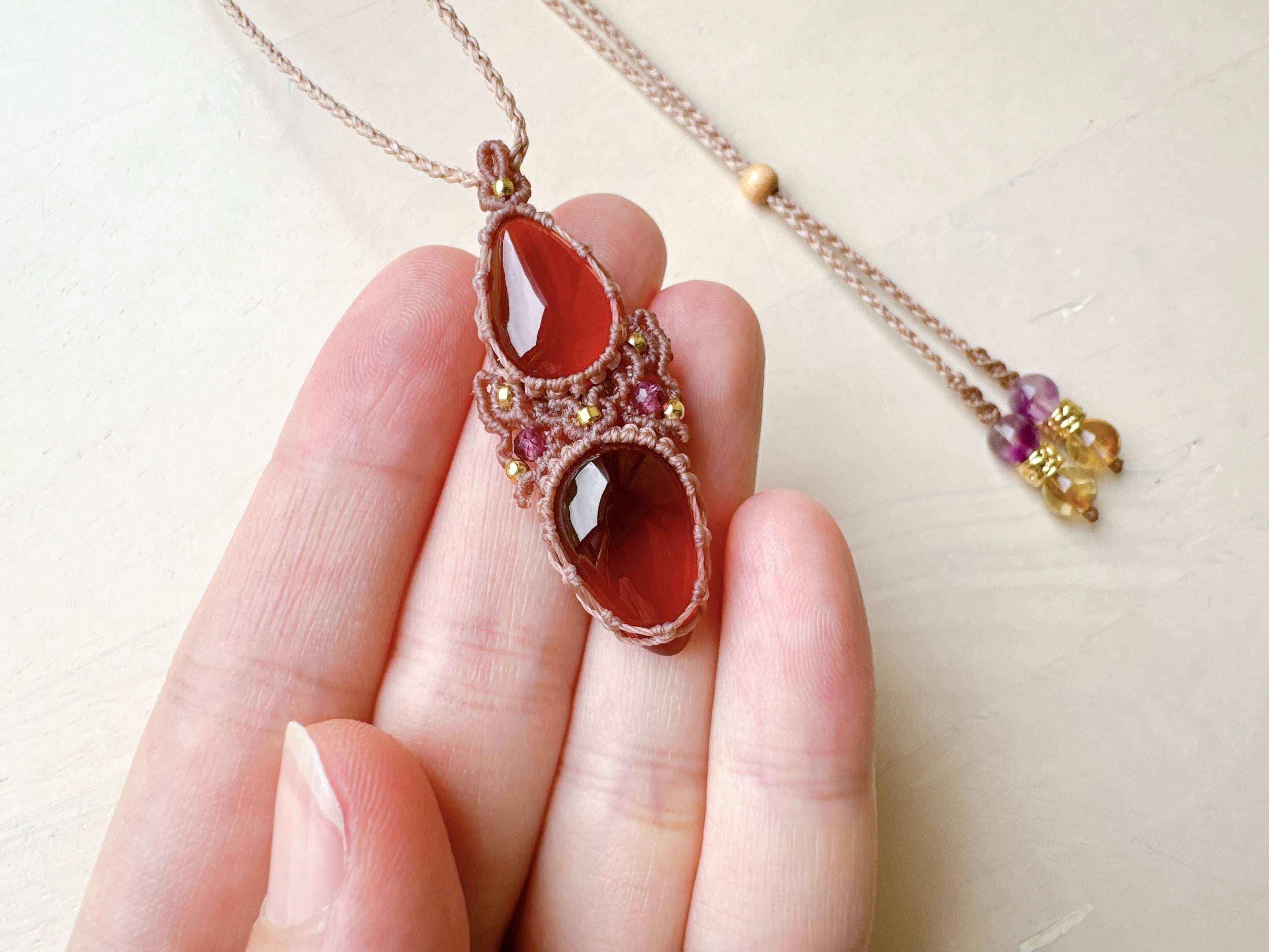 ペンダントトップにはロードライトガーネット、首紐にはフローライトとファントムシトリンビーズを使用しています。