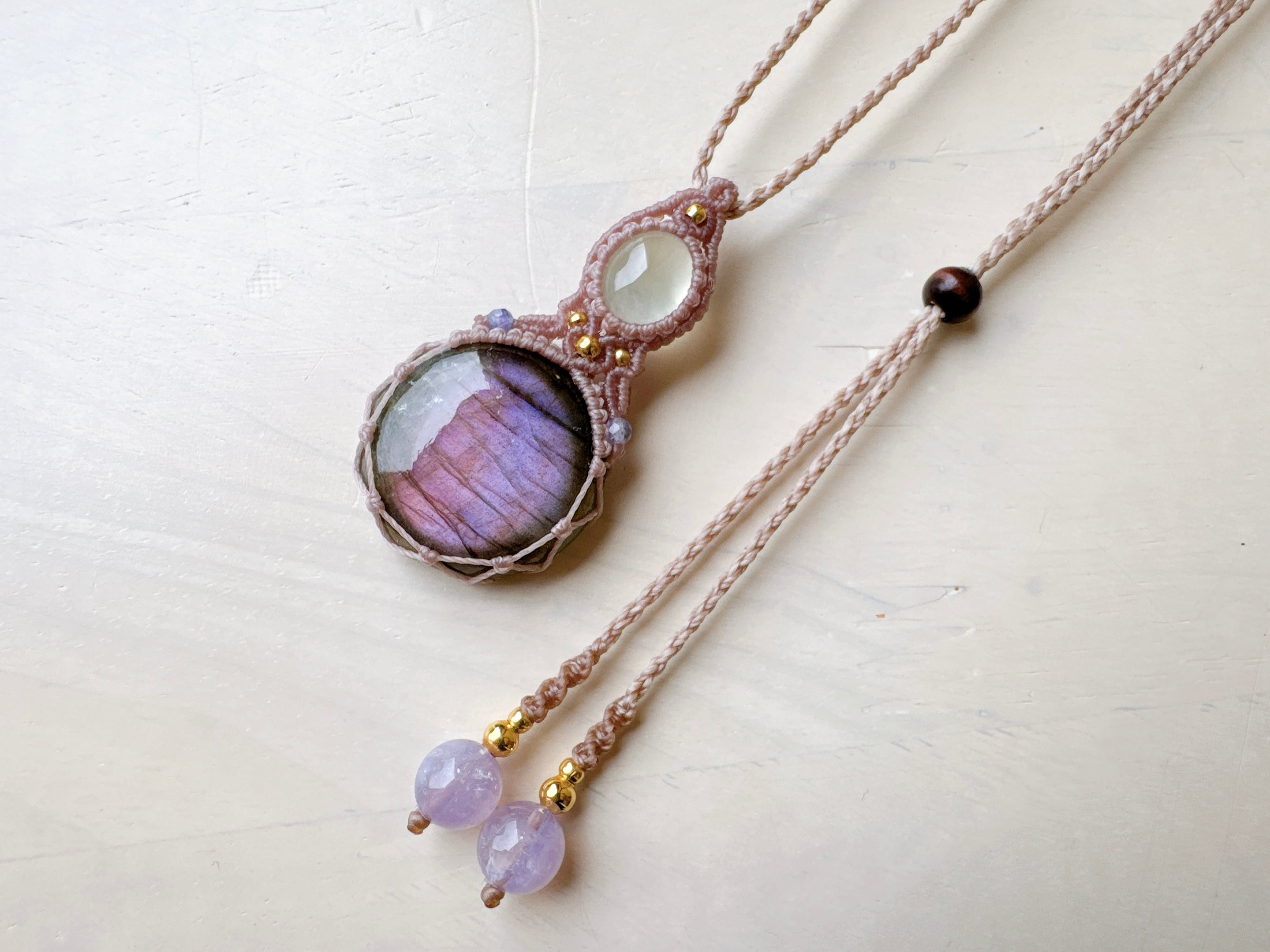 ピンクパープルなシラーが可愛らしいまん丸ラブラドライトに、ぶどうの果肉のような高品質でプルツヤなプレナイトを合わせました。