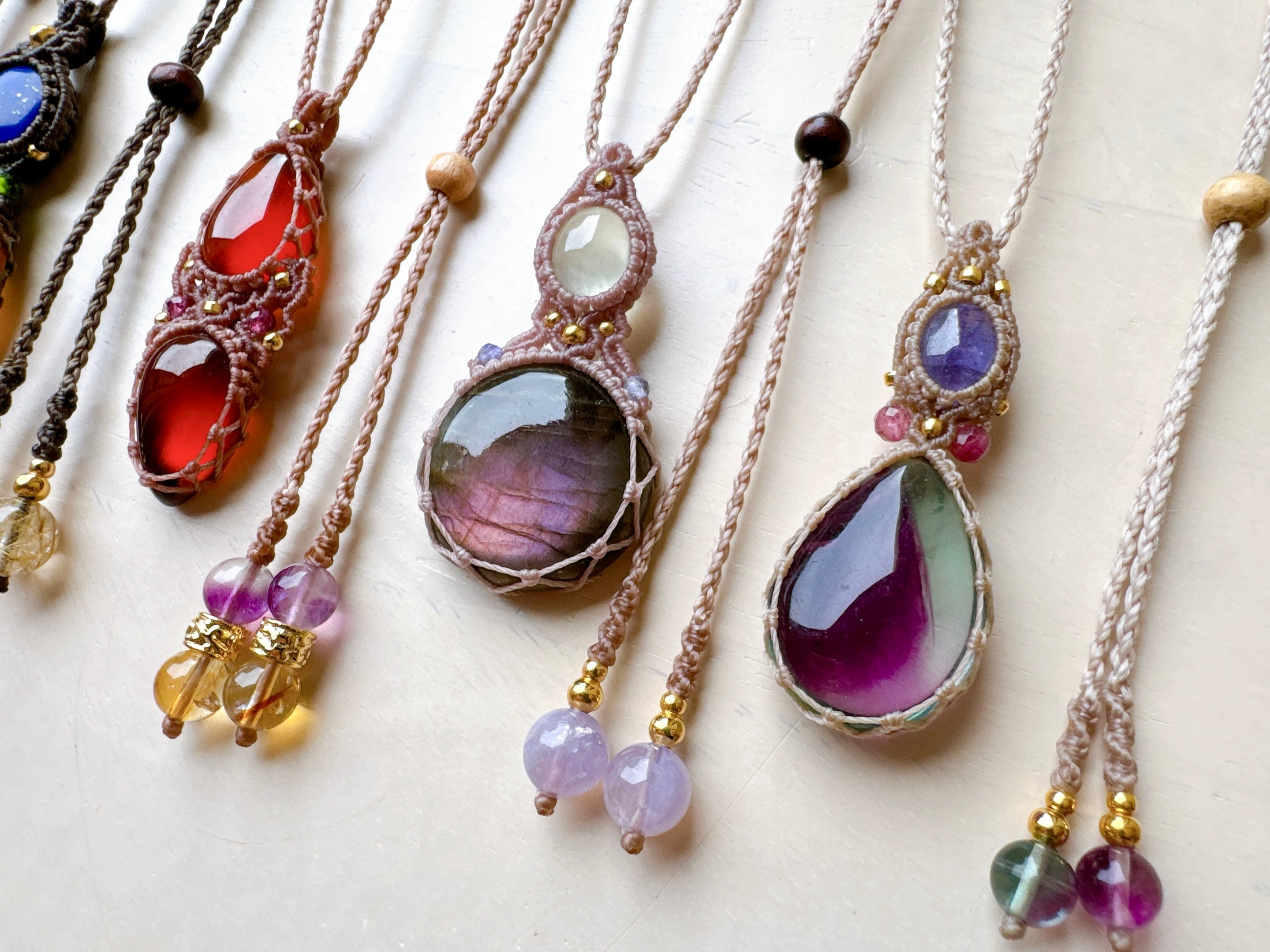 ペンダントトップにはピンクトルマリン、首紐にはフローライトビーズを使用しています。