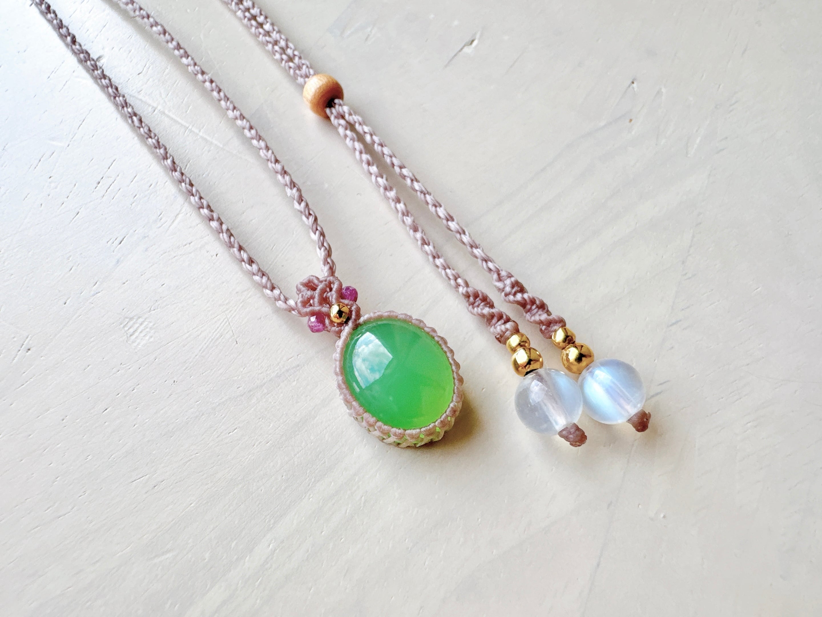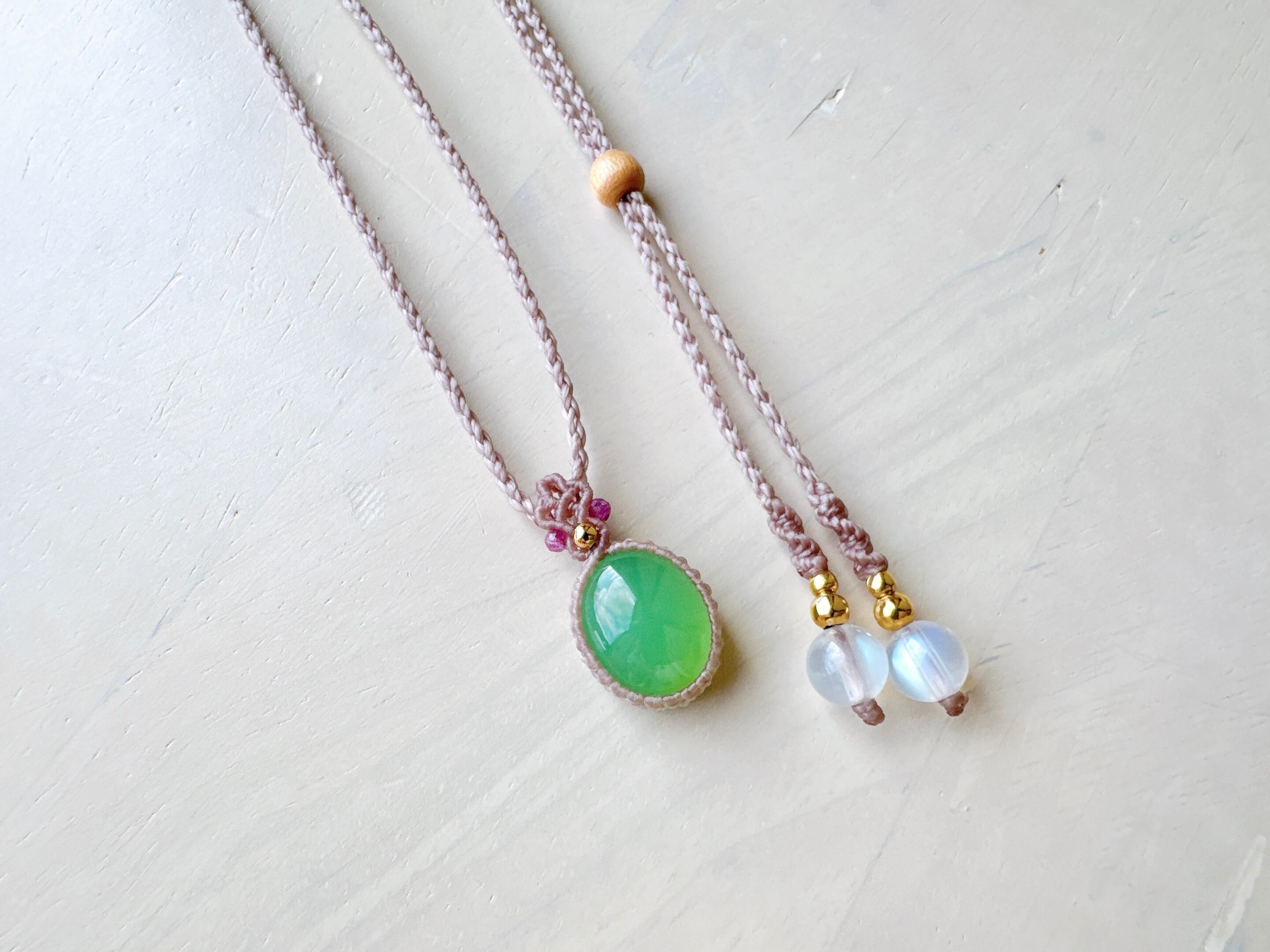 優しい印象のクリソプレーズに鮮やかなルビービーズを合わせました。