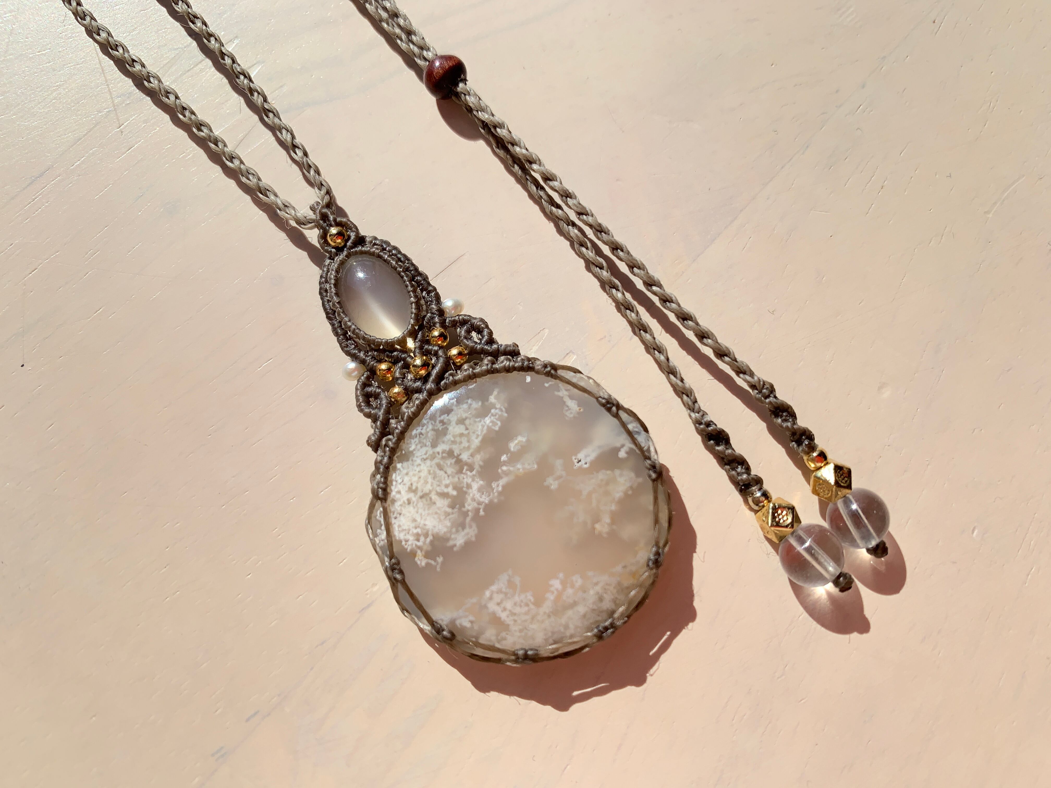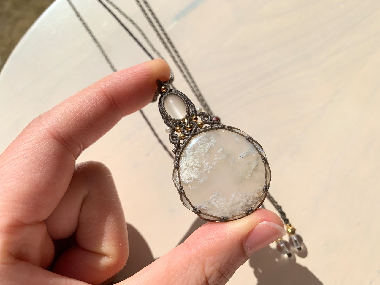白いインクルージョンが美しいモスアゲートに白いムーンストーンを合わせました。