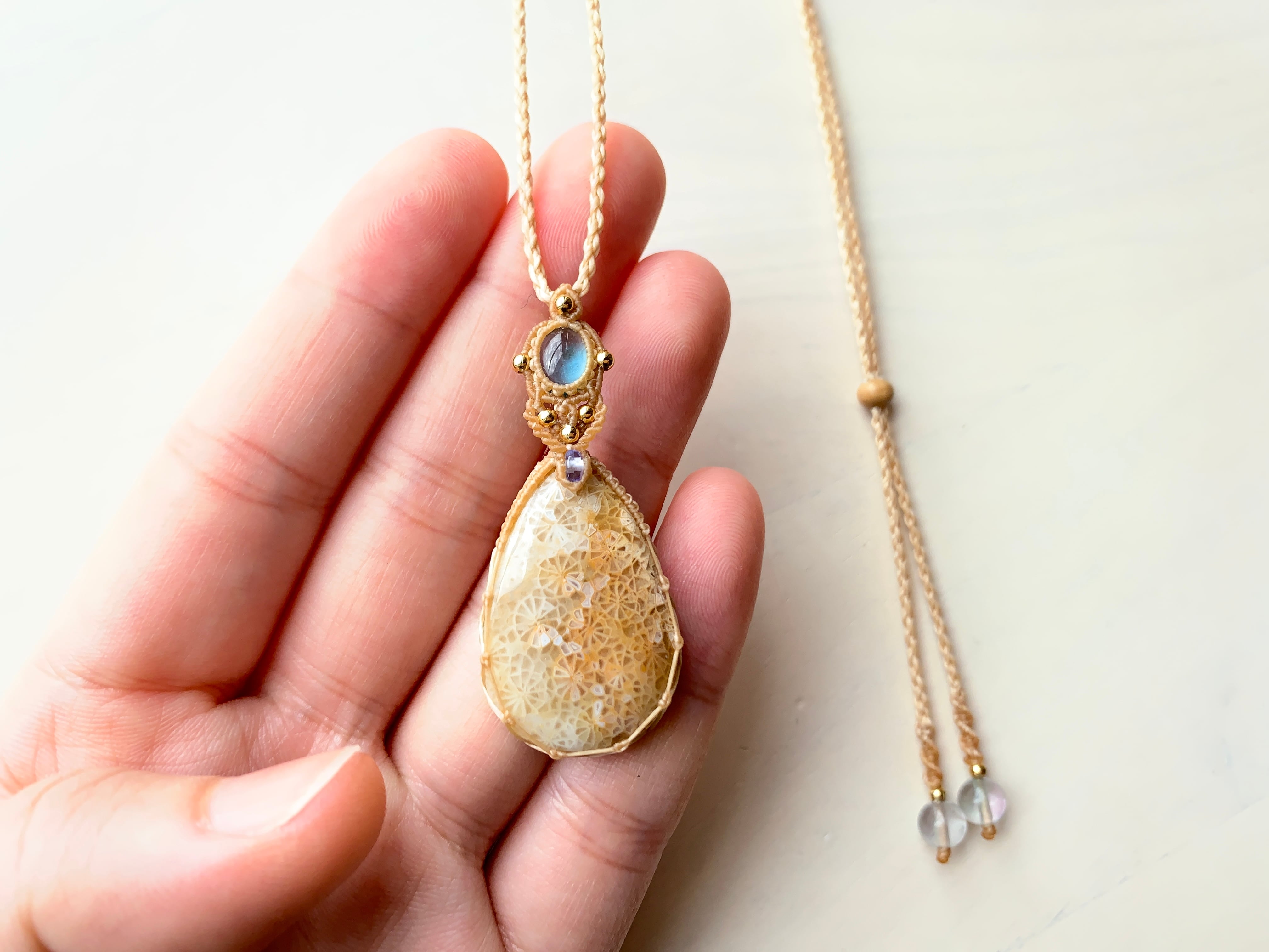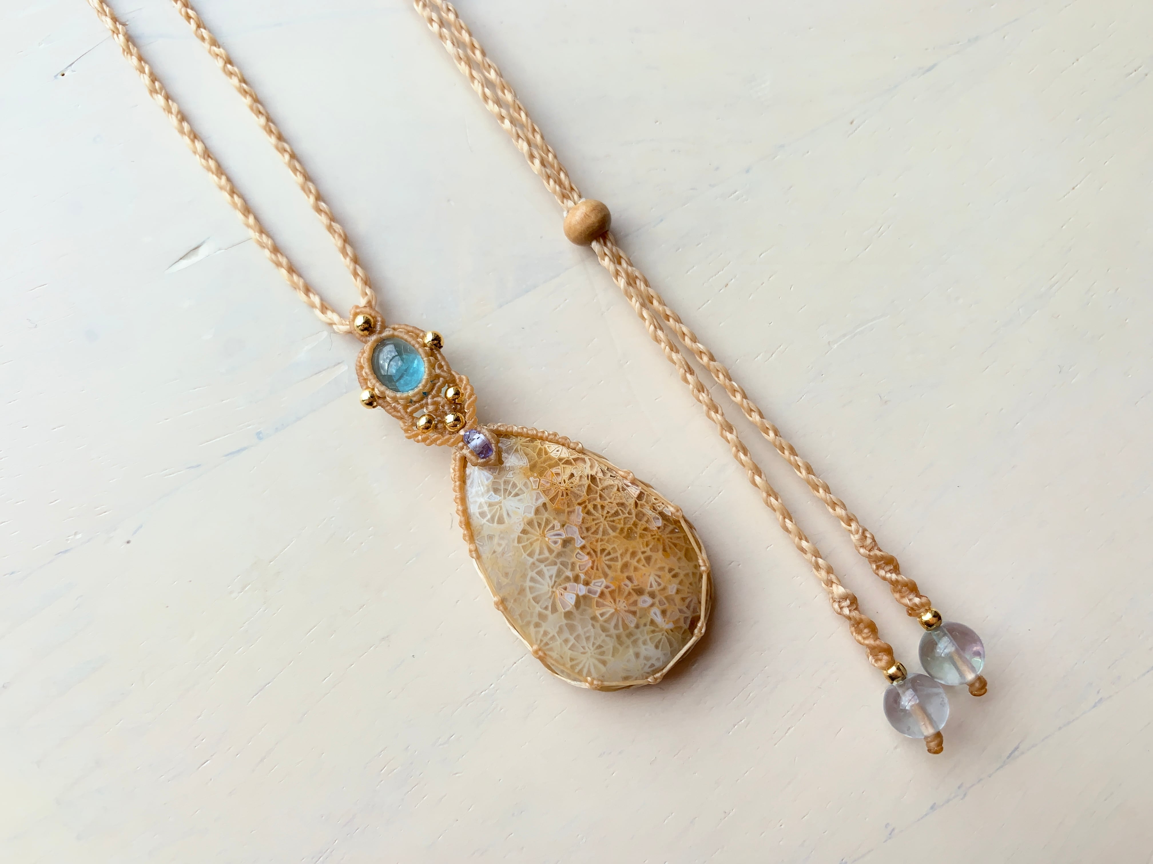 アゲートの透明感の中に化石のマットな質感が残った個性的なフォッシルコーラルに、透明度が抜群で鮮やかな水色のアパタイトを合わせました。