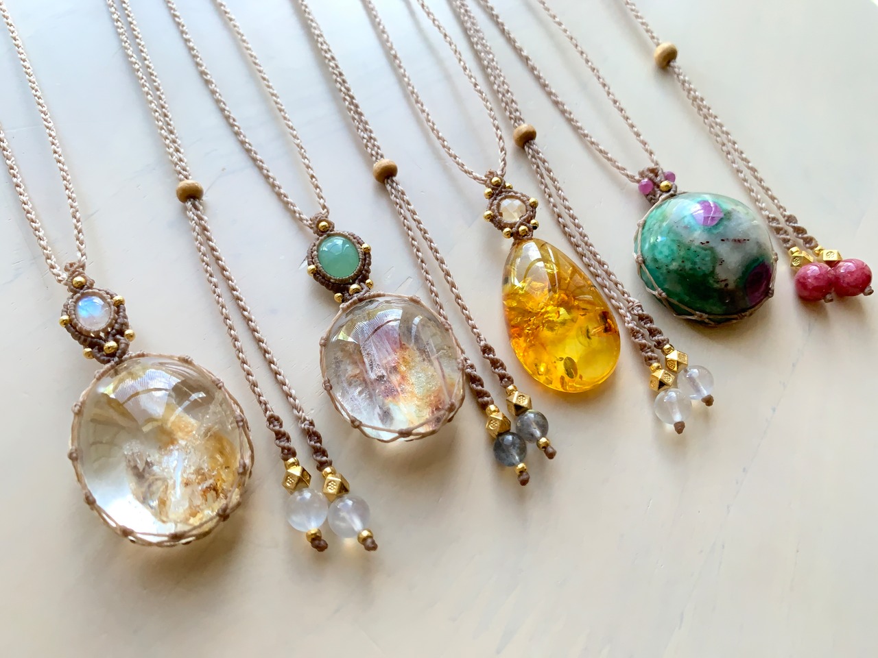 ガーデンクォーツ内のクラックに角度によっては虹が見えます。ホワイトラブラドライトは小粒ながらシラーがとっても美しいものを使用しました。