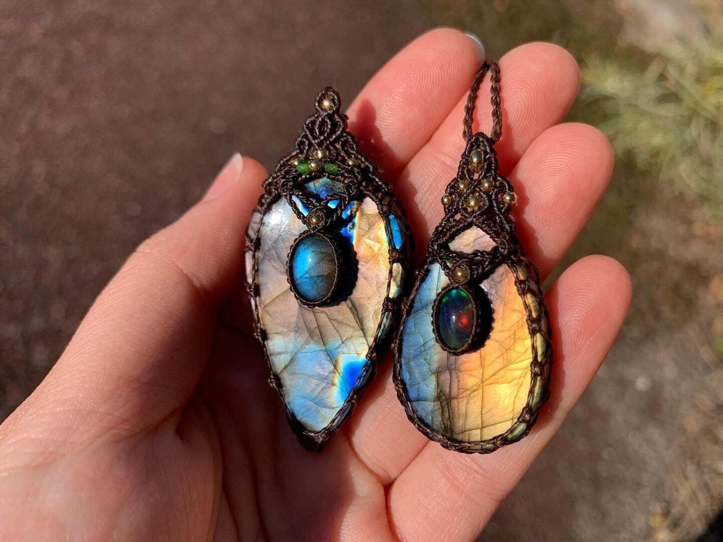 ブラウンのシラーが印象的な大きなラブラドライトにブルーシラーの小粒なラブラドライトを重ねました。