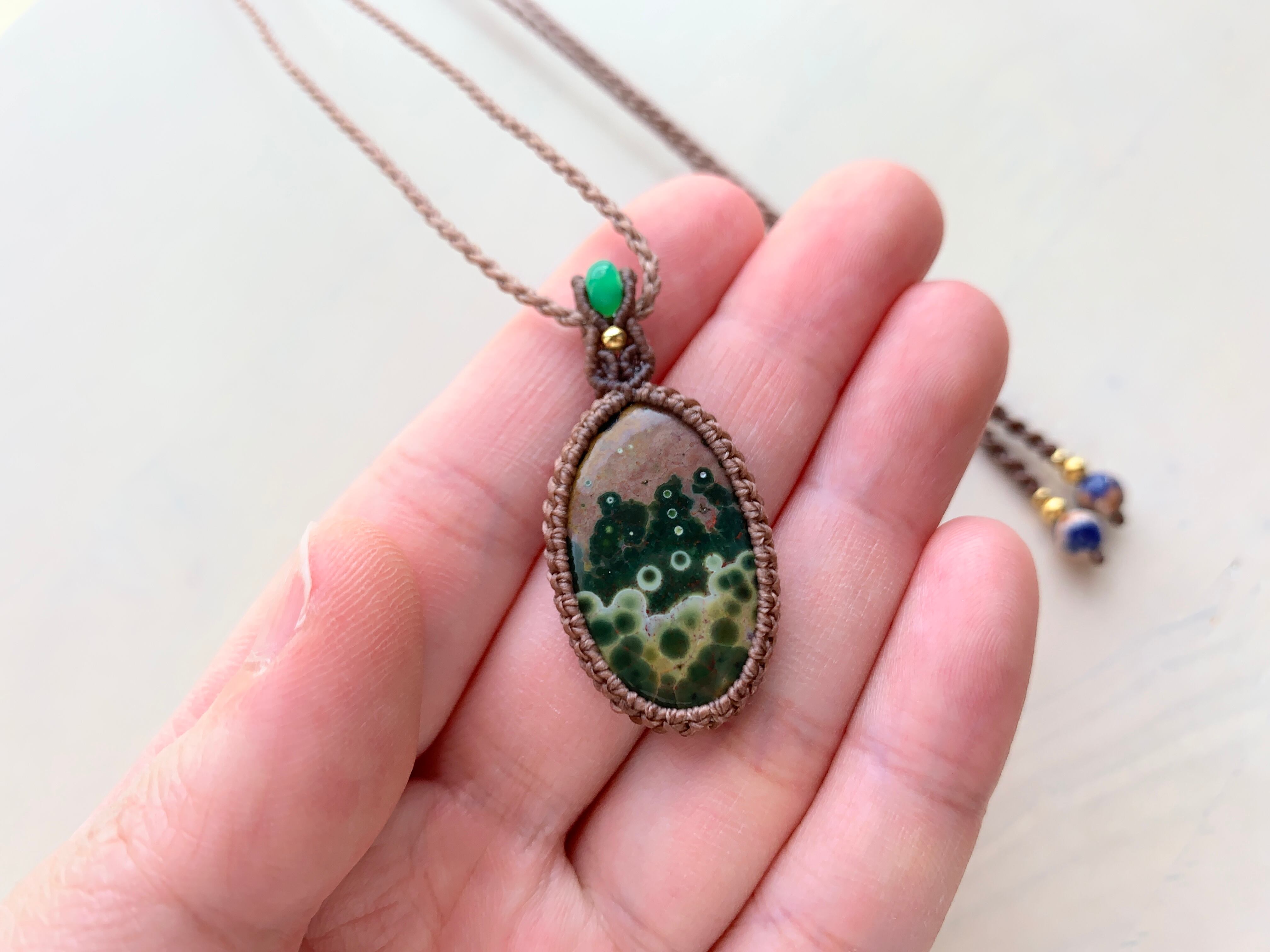 個性的なオーシャンジャスパーのペンダントです。鮮やかなクリソプレーズビーズと合わせました。