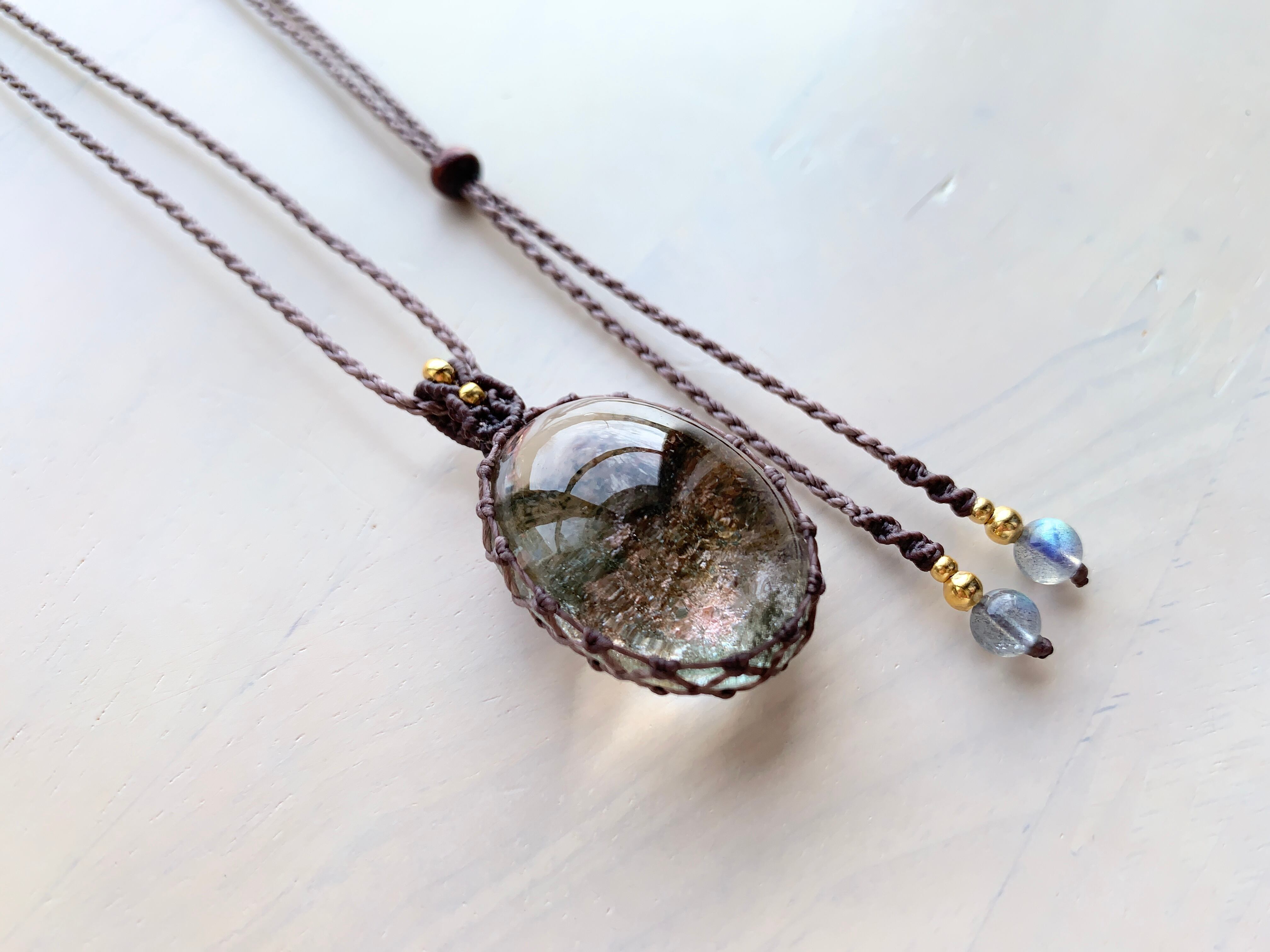 深緑とサーモンピンク、黄土色が混在したツヤツヤコロンなガーデンクォーツペンダントです。