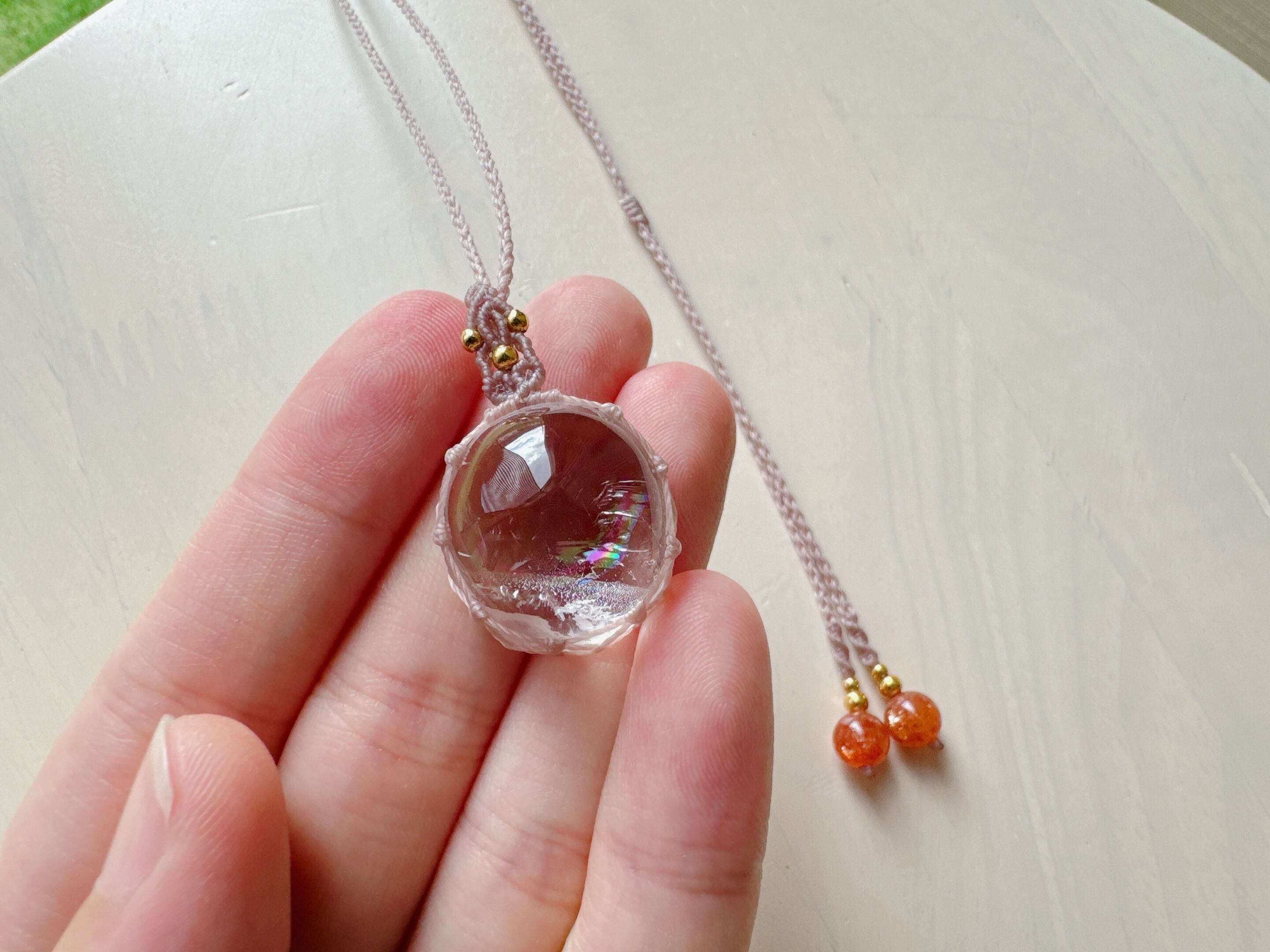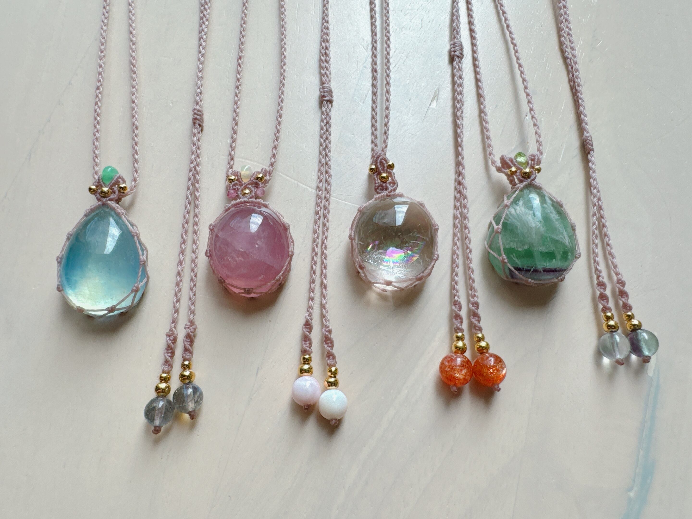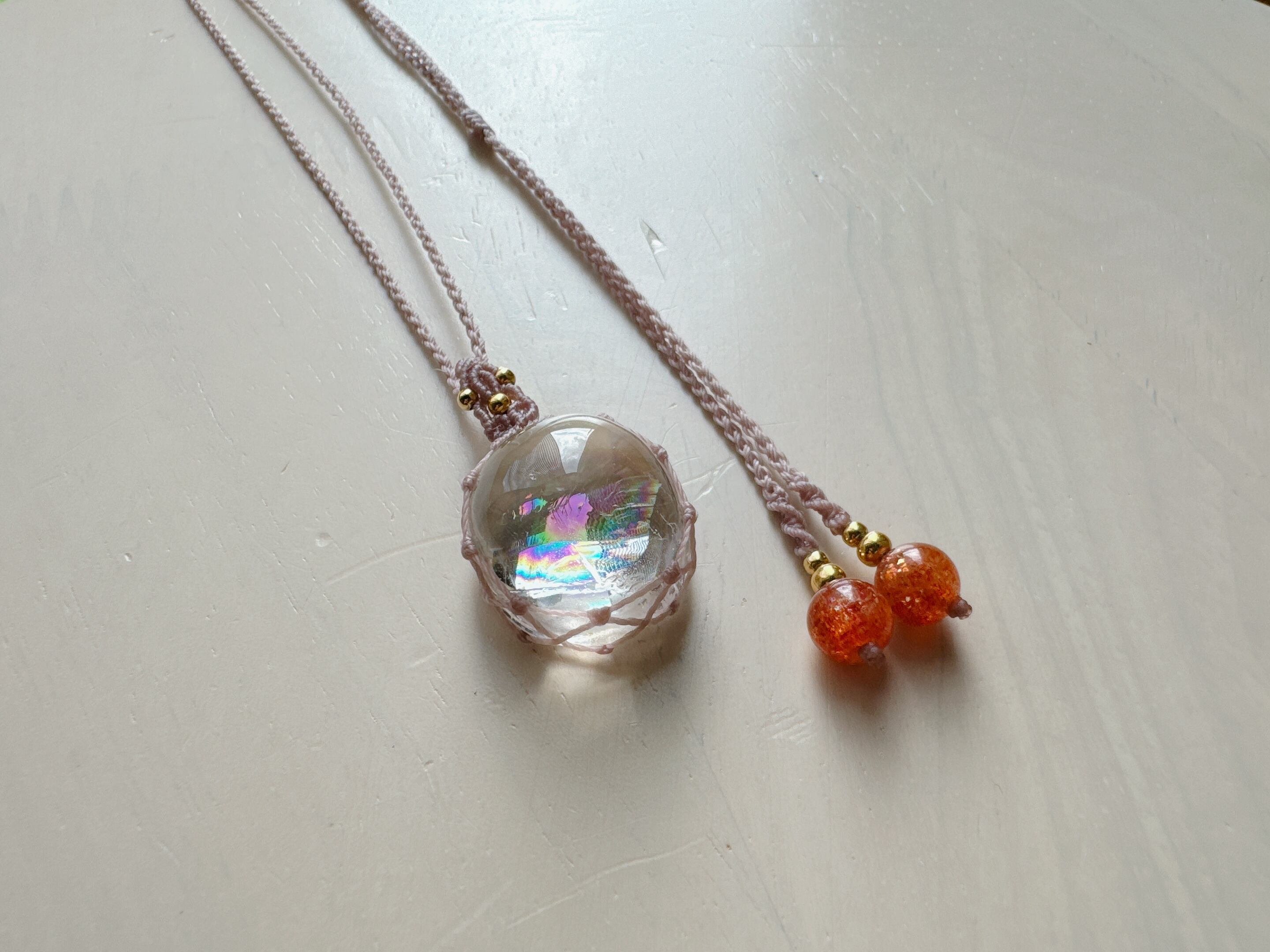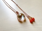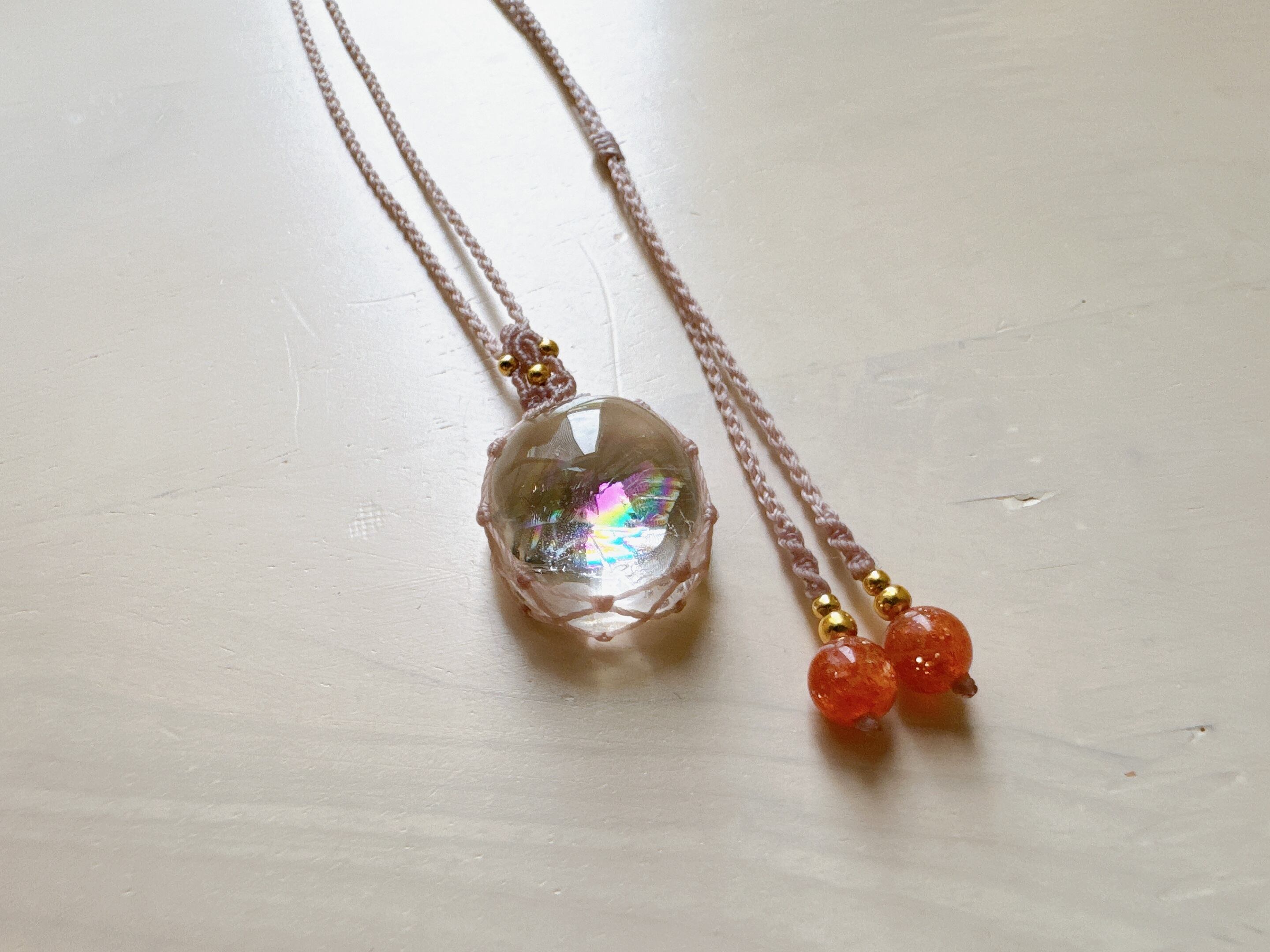 身につけやすい大きさのぷっくりとしたアイリスクォーツをシンプルに仕立てました。首紐のエンドには高品質なサンストーンを使用しています。